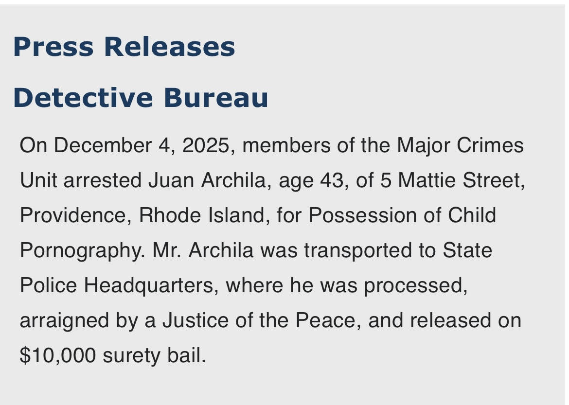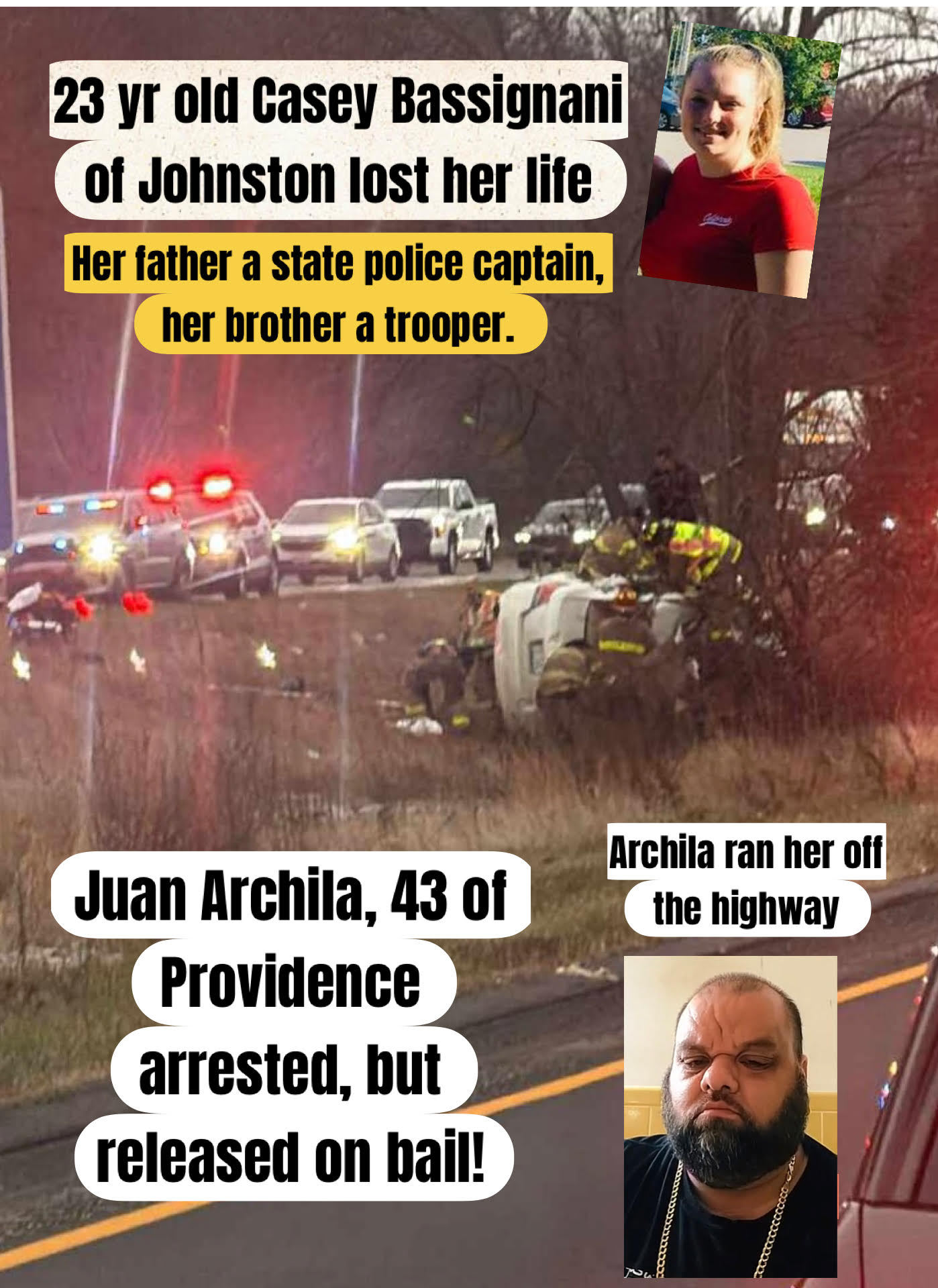 Last week: operator of the second vehicle involved, identified as Juan Archila, age 43 of Providence, was later located and taken into custody without incident. Archila was charged with Driving to Endanger – Death Resulting, held overnight and arraigned before a Justice of the Peace.