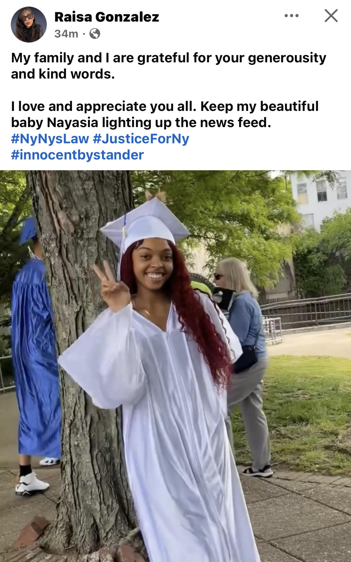 Your prayers, kindness, and generosity will help the family carry Nayasia’s light forward. Thank you for keeping Nayasia and her family close in your hearts. May her memory be a blessing, and may we honor her by fighting for a safer, more loving community for all. #JusticeForNy
